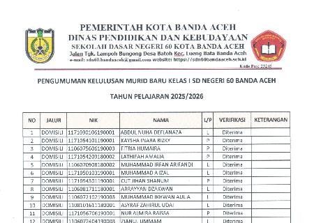 Pengumuman kelulusan SPMB SDN60 T.P 2025/2026 Daftar ulang bagi yang lulus di SD Negeri 60 Banda Aceh hari Jum'at dan Sabtu 27-28 Juli 2025 pukul 08.00-12.00 disekolah (harus daftar ulang dan bagi yang tidak daftar ulang sampai hari sabtu dianggap mengundurkan diri) Syarat berkas daftar ulang:1. Formulir Asli Pendaftaran yang sudah ditempel foto 4x6 (yan...